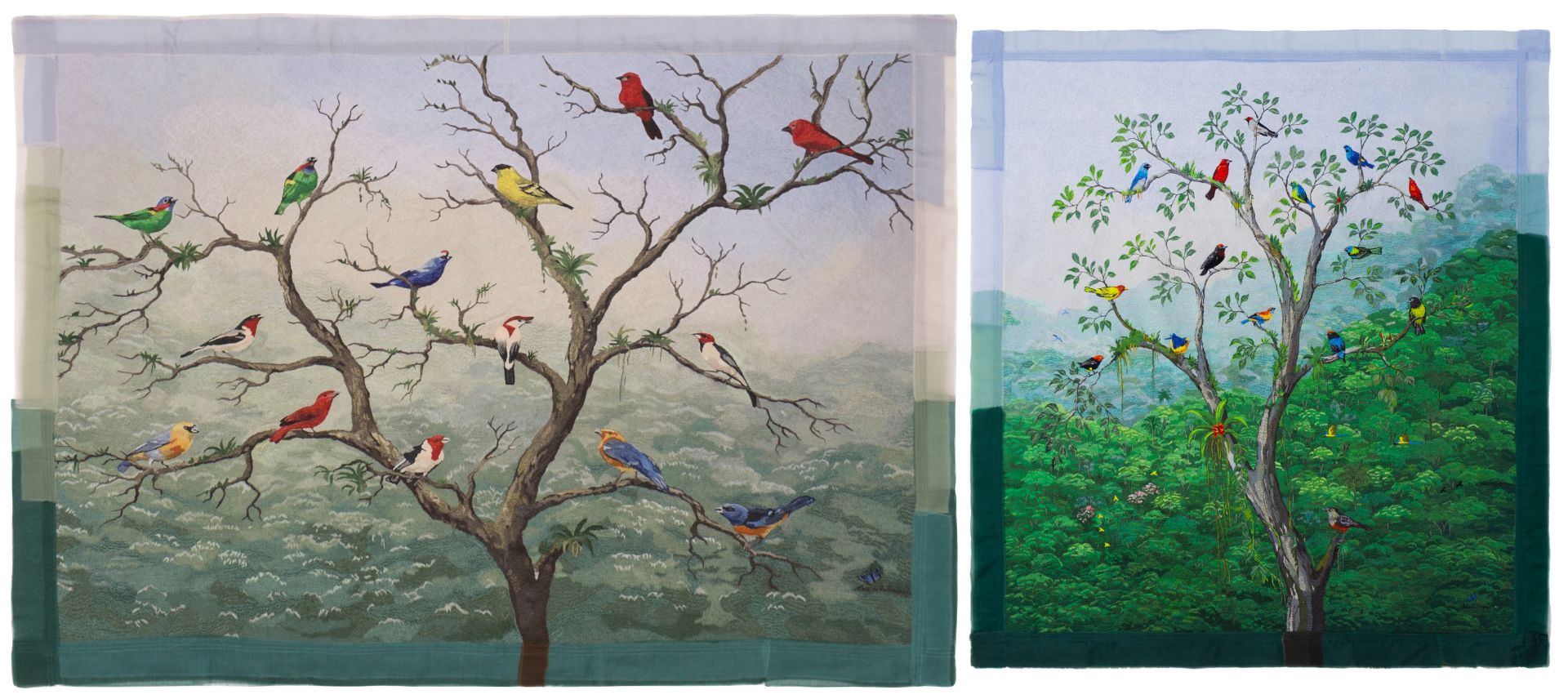 Na coleção criada em colaboração com Lelli, o toque trazido pelas bordadeiras é ainda mais impressionante, onde os pássaros dispostos na paisagem e nas arvores das cenas retratadas por Lelli parecem ganhar vida com as linhas entrelaçadas do bordado. Já as cenas de mata verde se tornam ainda mais belas quando recebem os diferentes pontos de bordados que agrega o efeito de profundidade da mata.