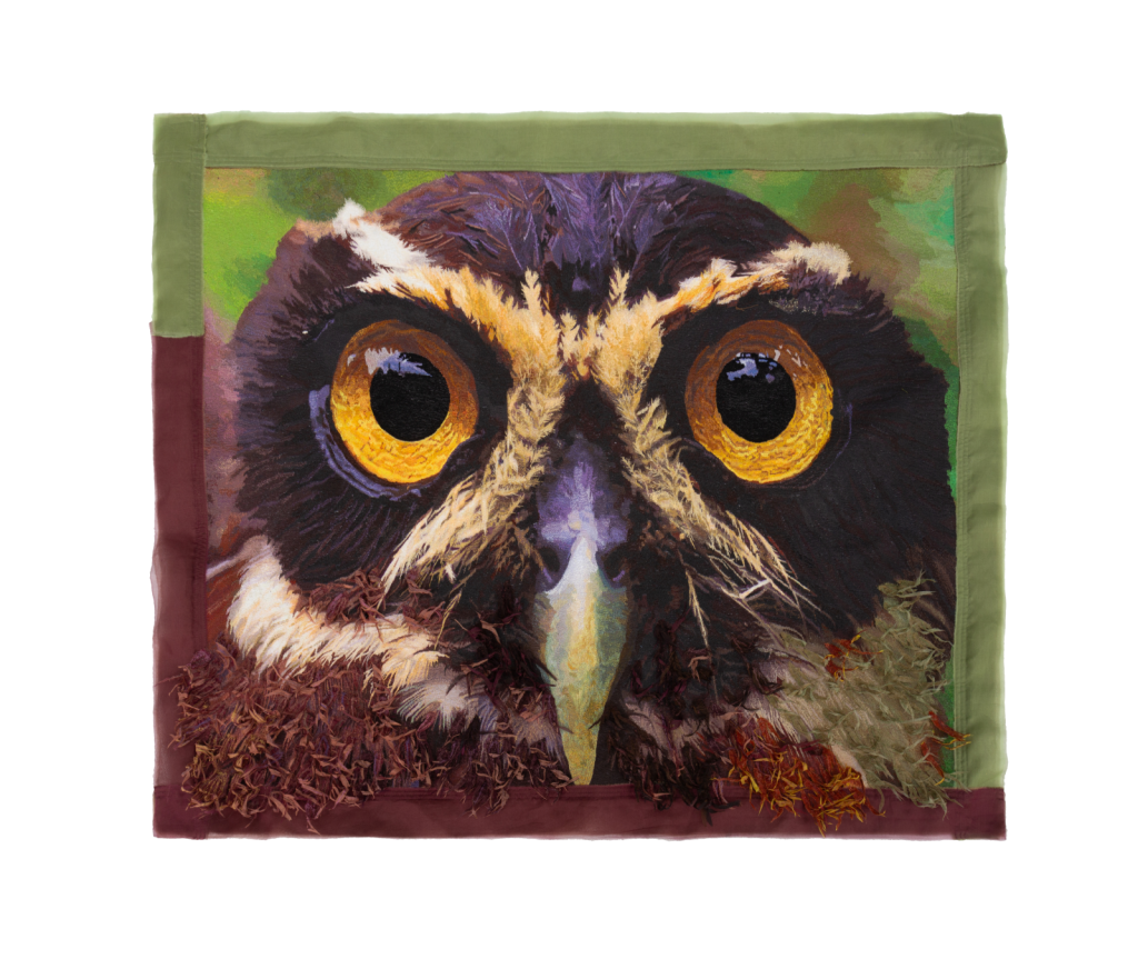 Amazônia – 2013 | À direita, tapeçaria bordada (1,34m x 1,12m) a partir da foto Coruja Murucututu (Pulsatrix perspicillata), Amazônia – 2010