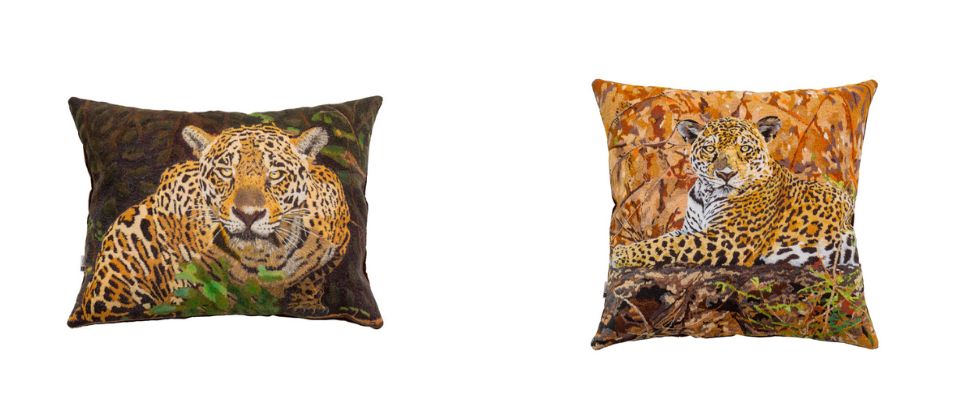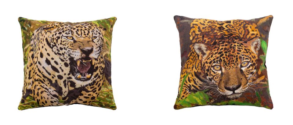 À esquerda, almofada bordada a partir da foto Onça-pintada (Panthera onca), Goiás – 2017 | À direita, almofada bordada a partir da foto Onça-pintada (Panthera onca), Rio Preto da Eva, Amazonas – 1996.
