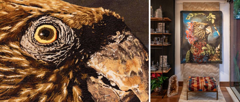 À esquerda, tapeçaria bordada (1,49 m x 1,19 m) a partir da foto Anacã (Deroptyus accipitrinus),