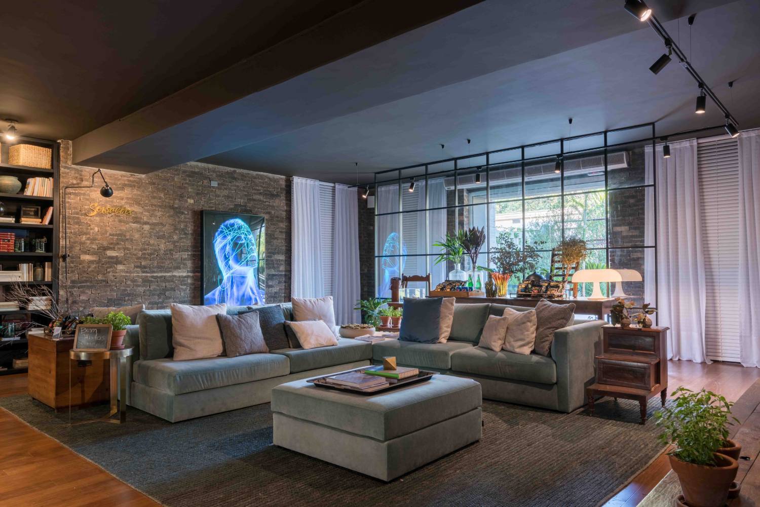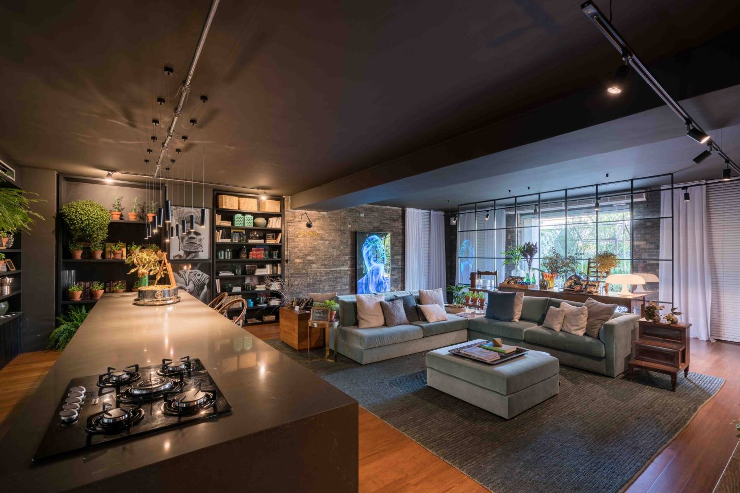 "Lounge Sensações™ de Gustavo Paschoalim da Casa Cor 2018, projetou uma cozinha gourmet que é integrada ao amplo living. A decoração é exposta nas estantes e inclui objetos dos séculos 18 e 19. O estilo prático se confirma na mesa extensa e multifuncional. Para suavizar, estofados azuis."