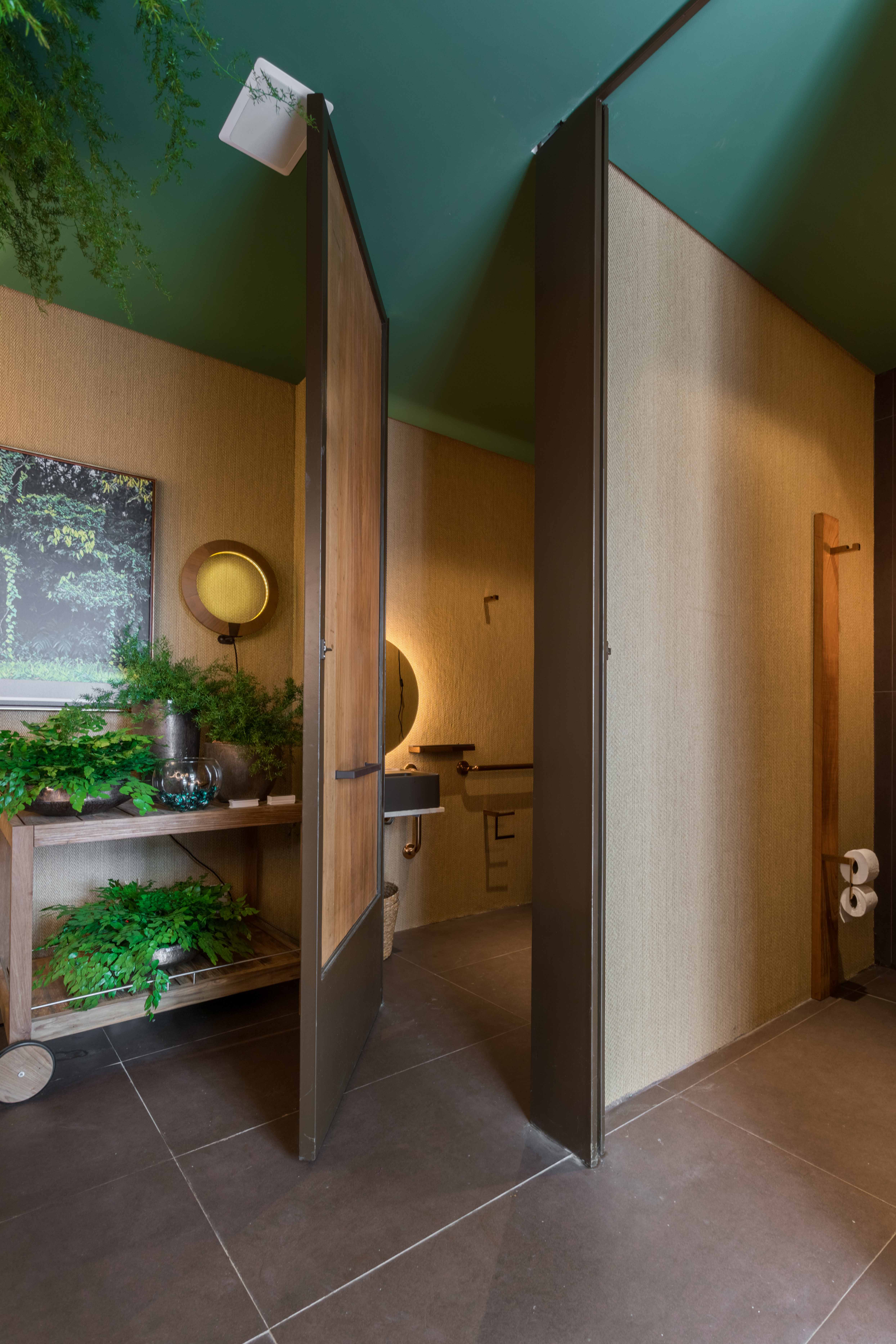 O "Banheiro dos Sentidos" de MeyerCortez na Casa Cor deste ano foi realizado para despertar os sentidos, além de buscar a força dos tons terrosos, a suavidade do bege, a elegância do dourado e o verde exuberante. Texturas, aromas e sons também promovem uma imersão nos 15 m².