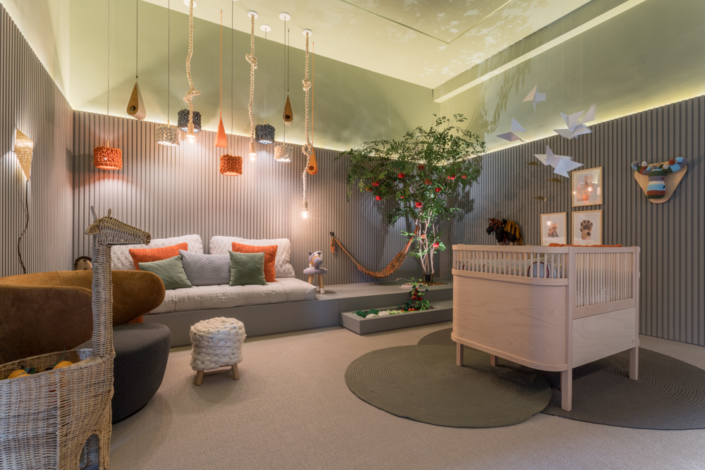 O Quarto de Bebê, projeto de Mayara Clá e Natasha Haddad, adotaram elementos lúdicos que estimulam o contato manual e a imaginação. Galhos de uma árvore desidratada se inserem no espaço.