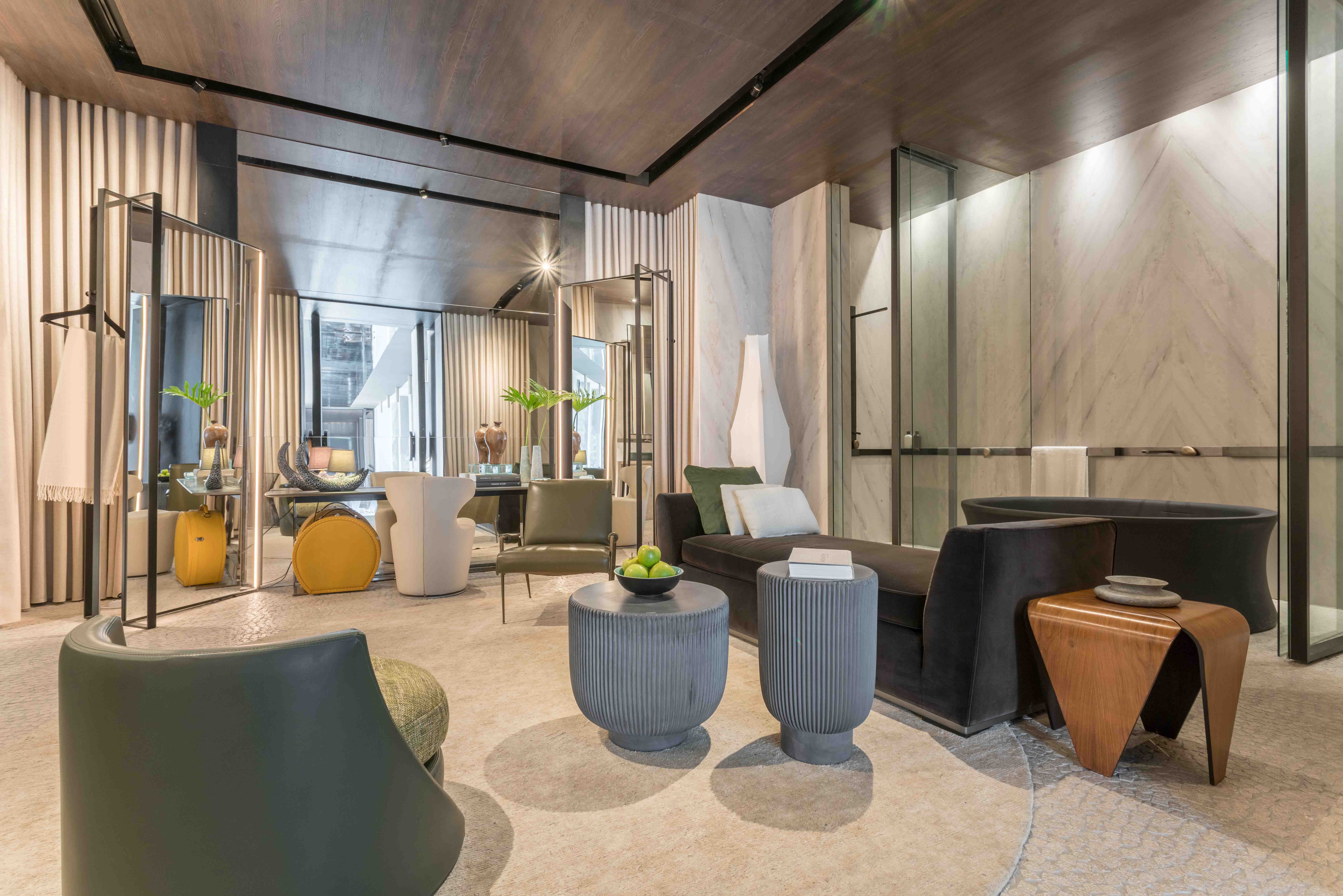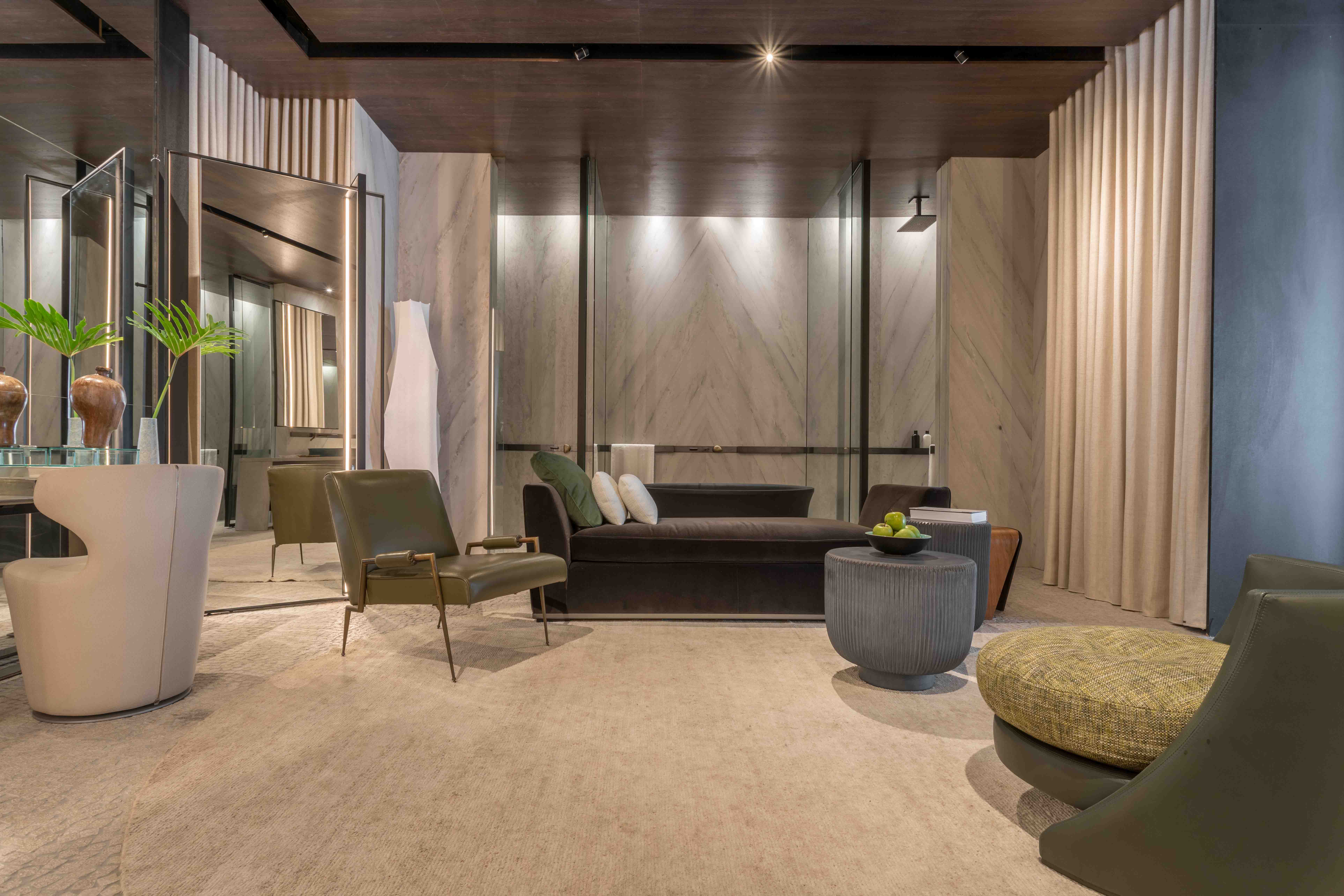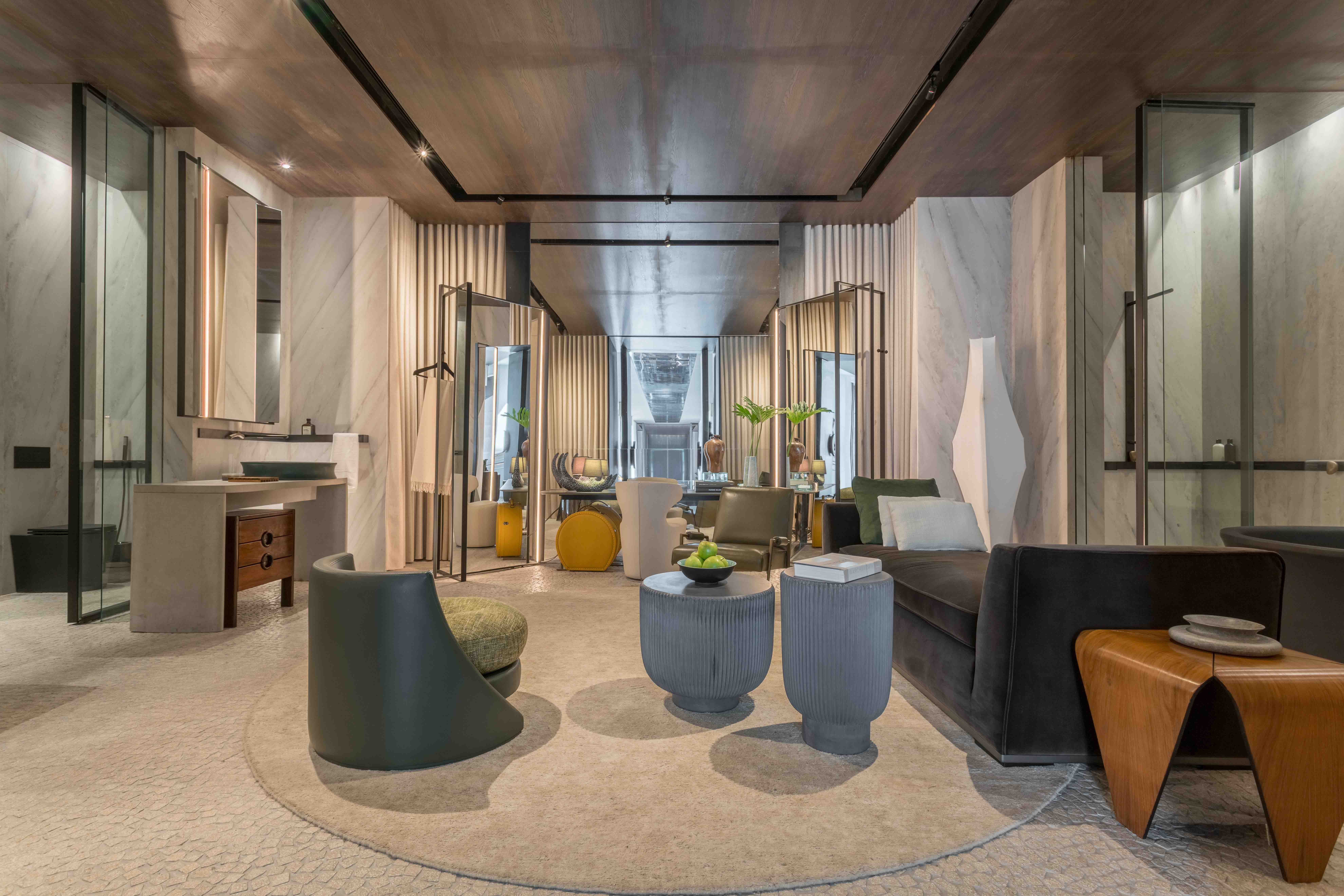 "O projeto A Cisterna de Deca de Tenório Studio faz reverência à água e transforma a galeria original do Jockey em um reservatório, com direito a cascata e sala de banho. Cortinas ressaltam a verticalidade no espaço, enquanto estofados de linhas suaves abraçam o visitante."