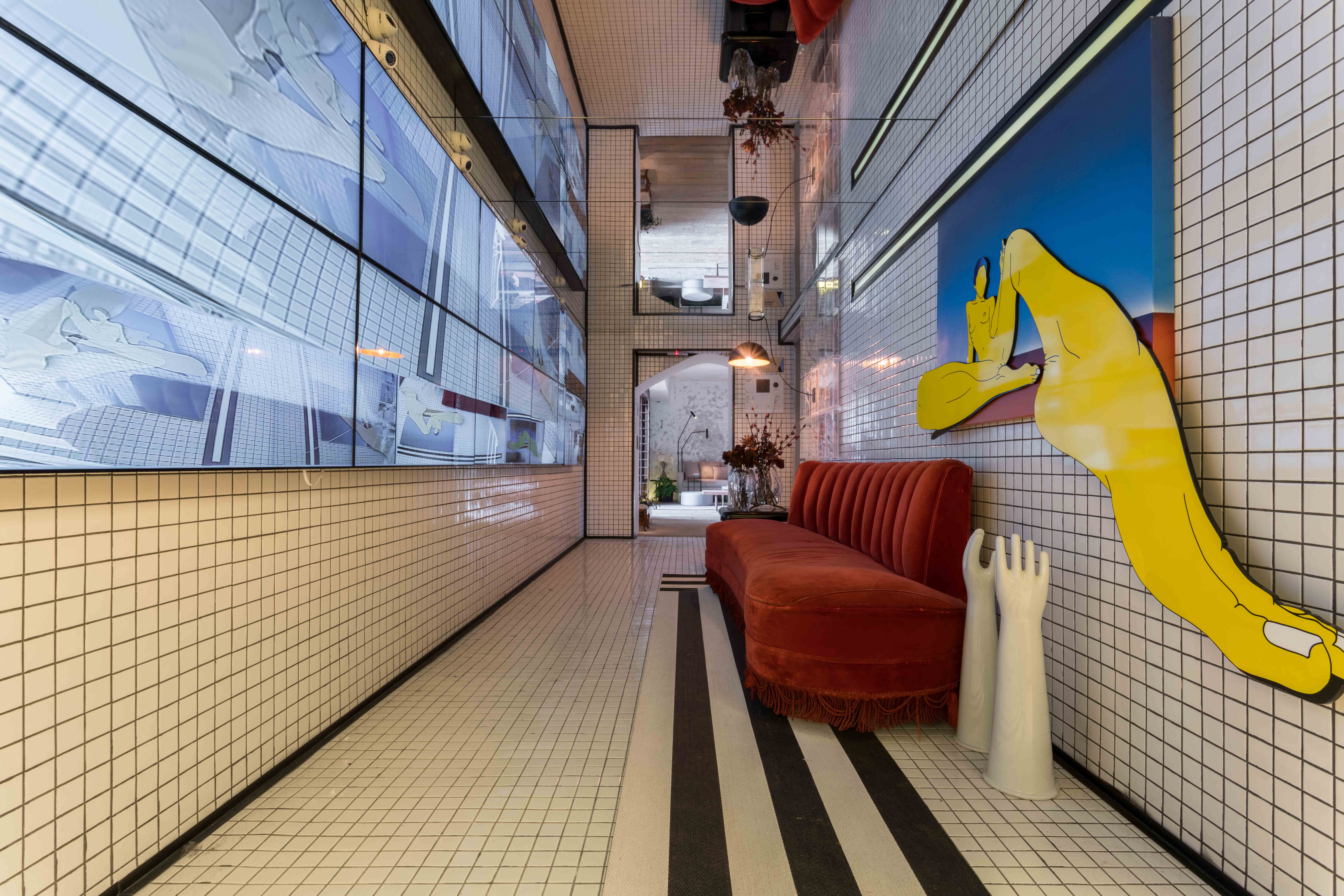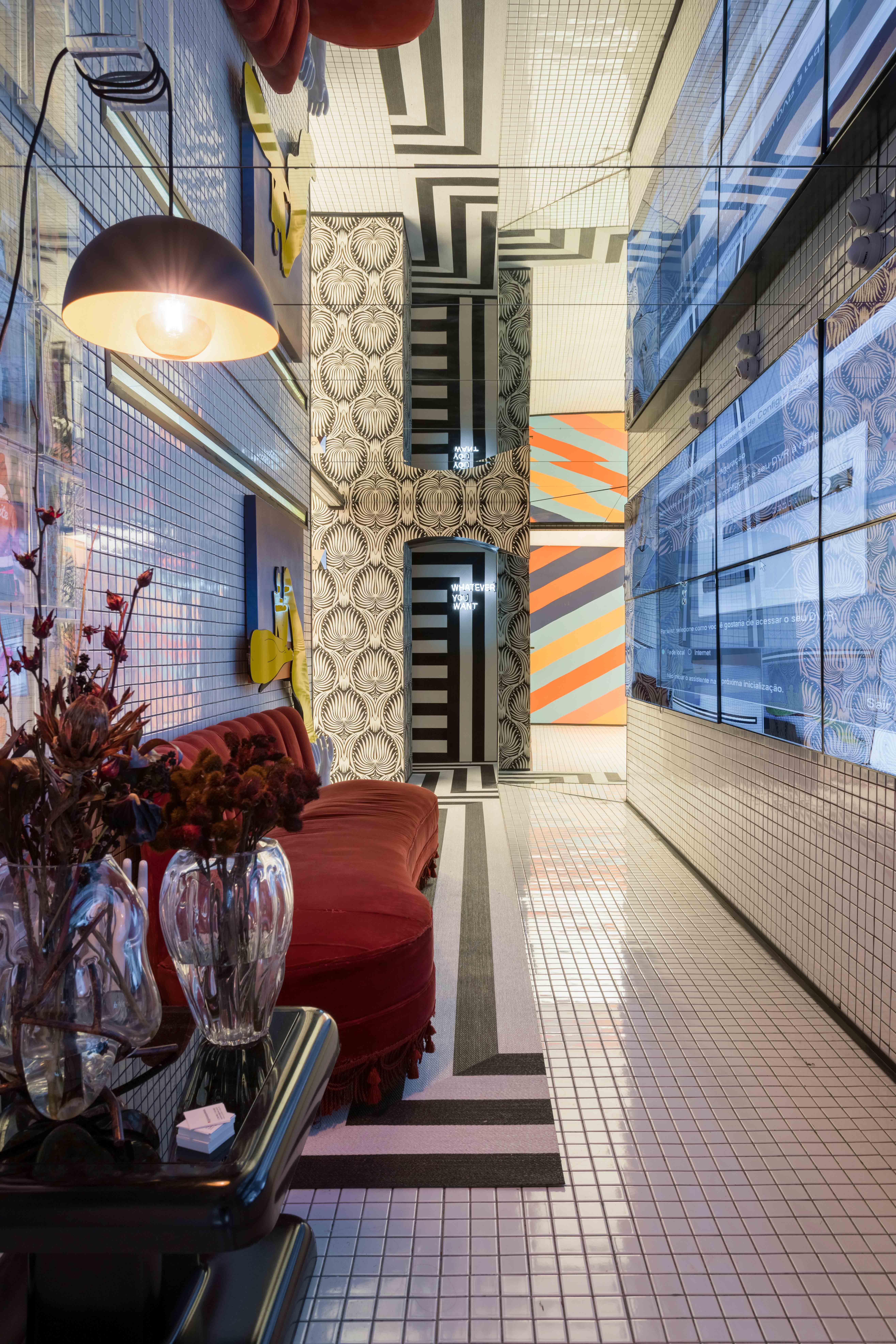 "O estilo Memphis e o clima de anos 1980 trazem descontração ao espaço de 30 m², intenso no geometrismo e nas cores presente no WC no Gender de Lisandro Piloni. Das divisórias aos revestimentos, passando pelo recorte dos espelhos, tudo transmite alegria e liberdade, em um lugar onde cada um pode ser o que quiser."