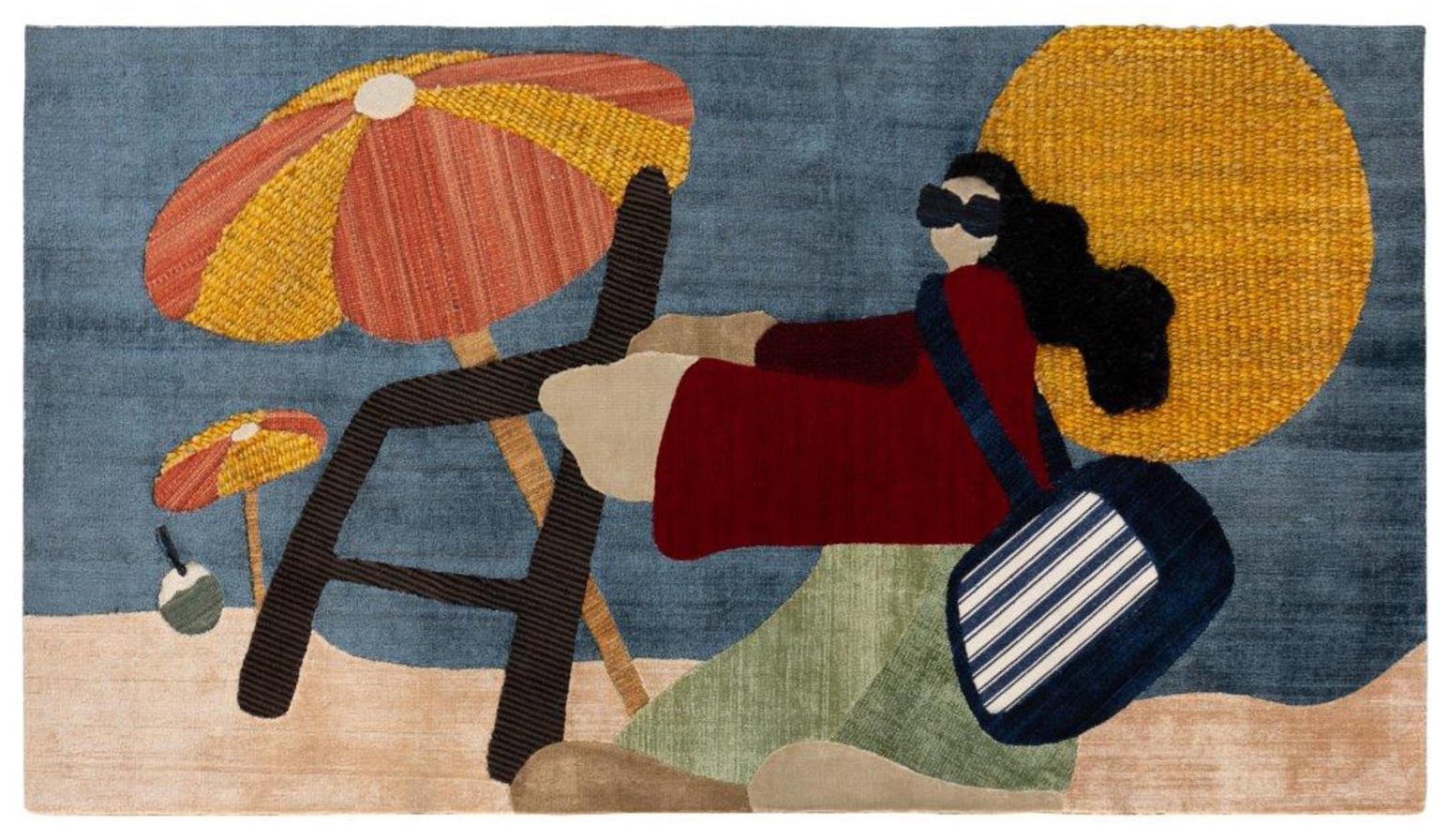 A tapeçaria “A Turista” remete à figura de uma turista imaginada pelo designer, vestida com a elegância típica da Faria Lima paulistana, que chega ao Rio de Janeiro para uma reunião no Leblon, um dos mais badalados destinos da Zona Sul carioca.