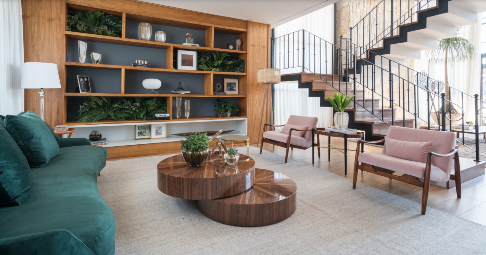 Na sala, em frente, foi reciclada a estante embutida, que já fazia parte do imóvel, Ana enriqueceu-a com objetos decorativos da loja LS Selection, além de algumas plantas, para dar vida à área. A mesa de centro de Reinaldo Lourenço, assinada para a Breton, e o tapete da By Kamy, compõem o ambiente com o sofá curvo verde, e as cadeiras rosa, que já pertenciam à moradora.