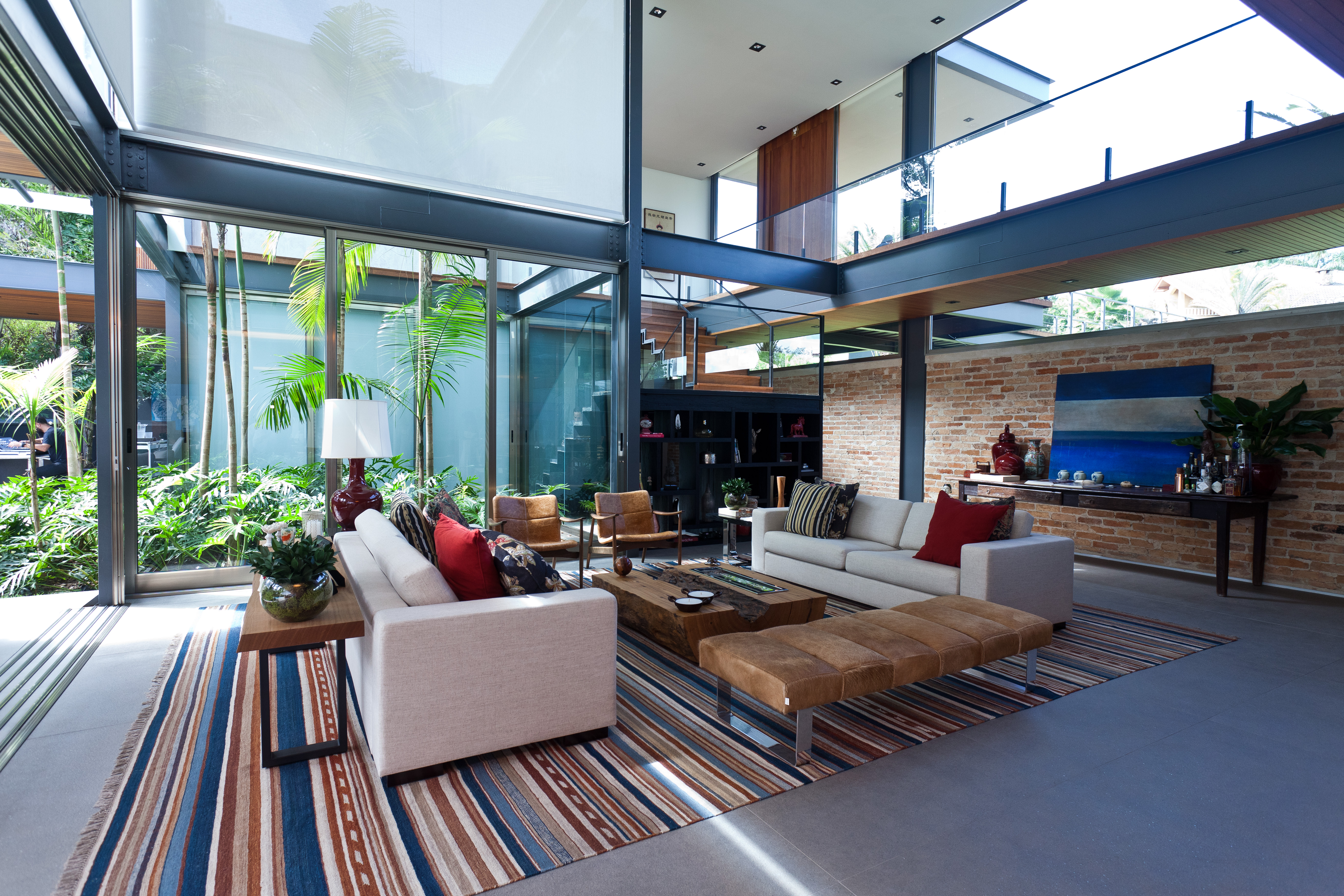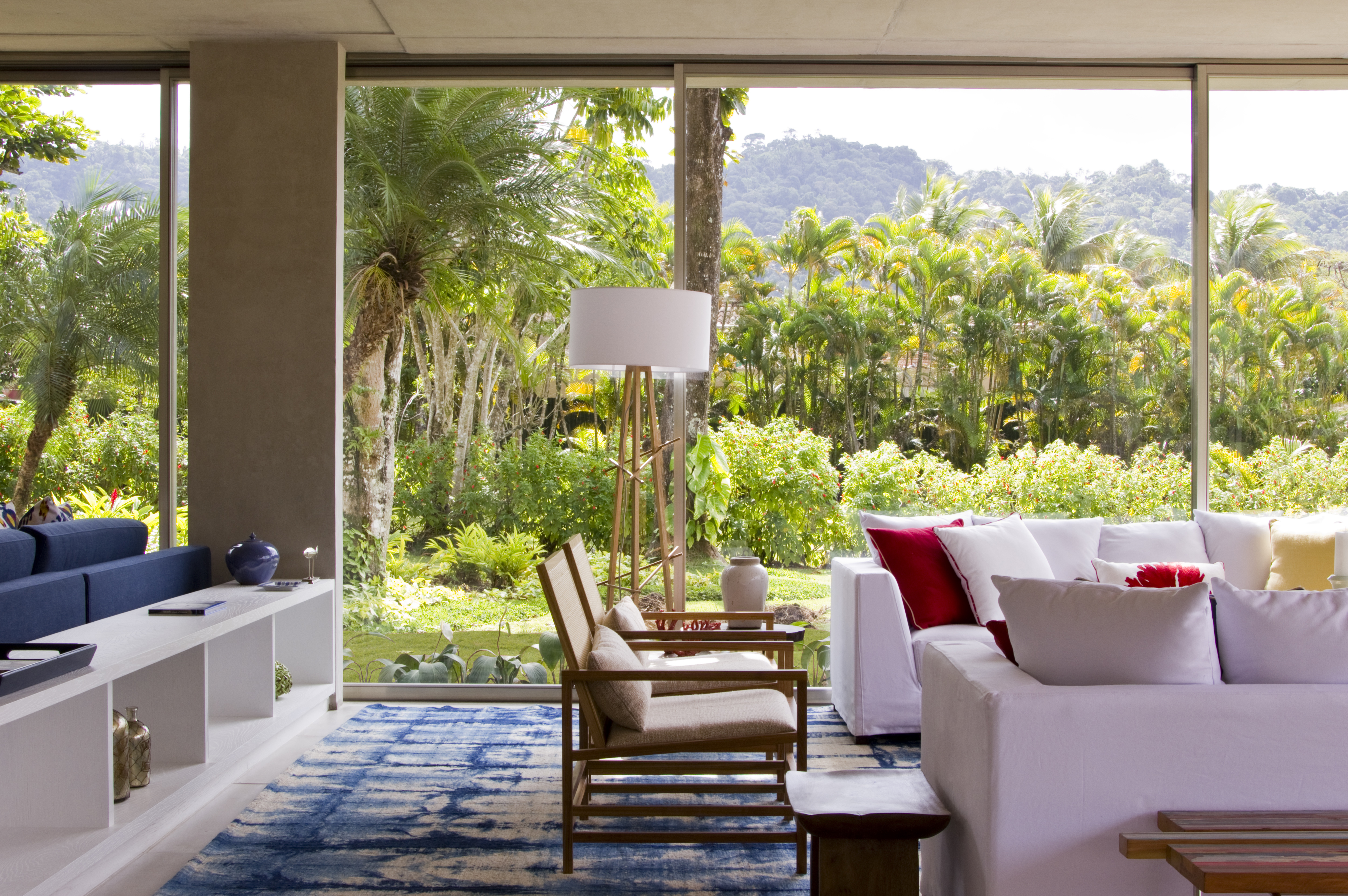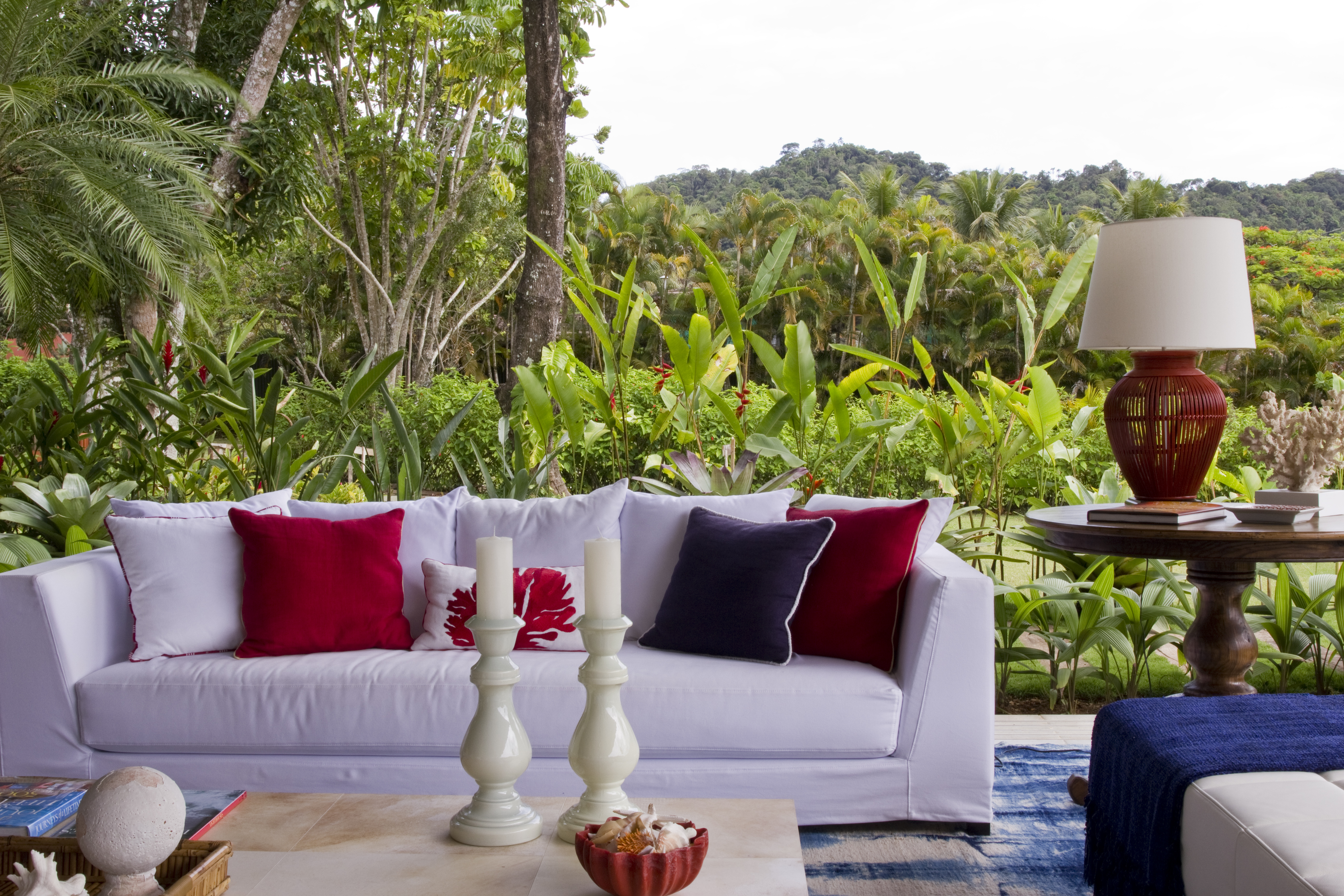 Outro ótimo exemplo é o trabalho de Marilia Veiga. Observe como o detalhe das flores vermelhas é retomado na cor das almofadas e vasos e o azul, que predominam na paisagem, ocupa também uma vasta área seja pelo tapete, como também pelas mantas, estofados e objetos de decoração.