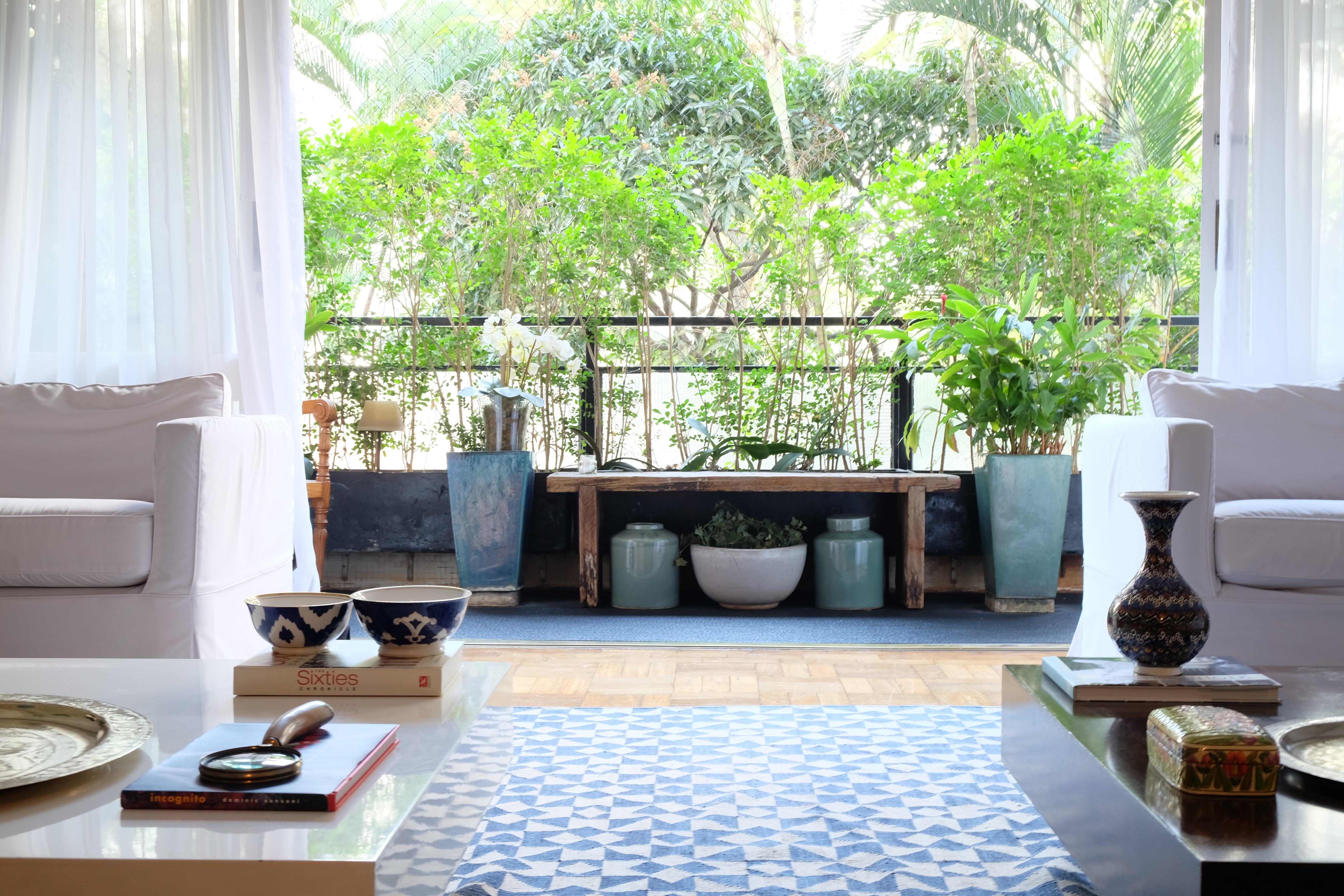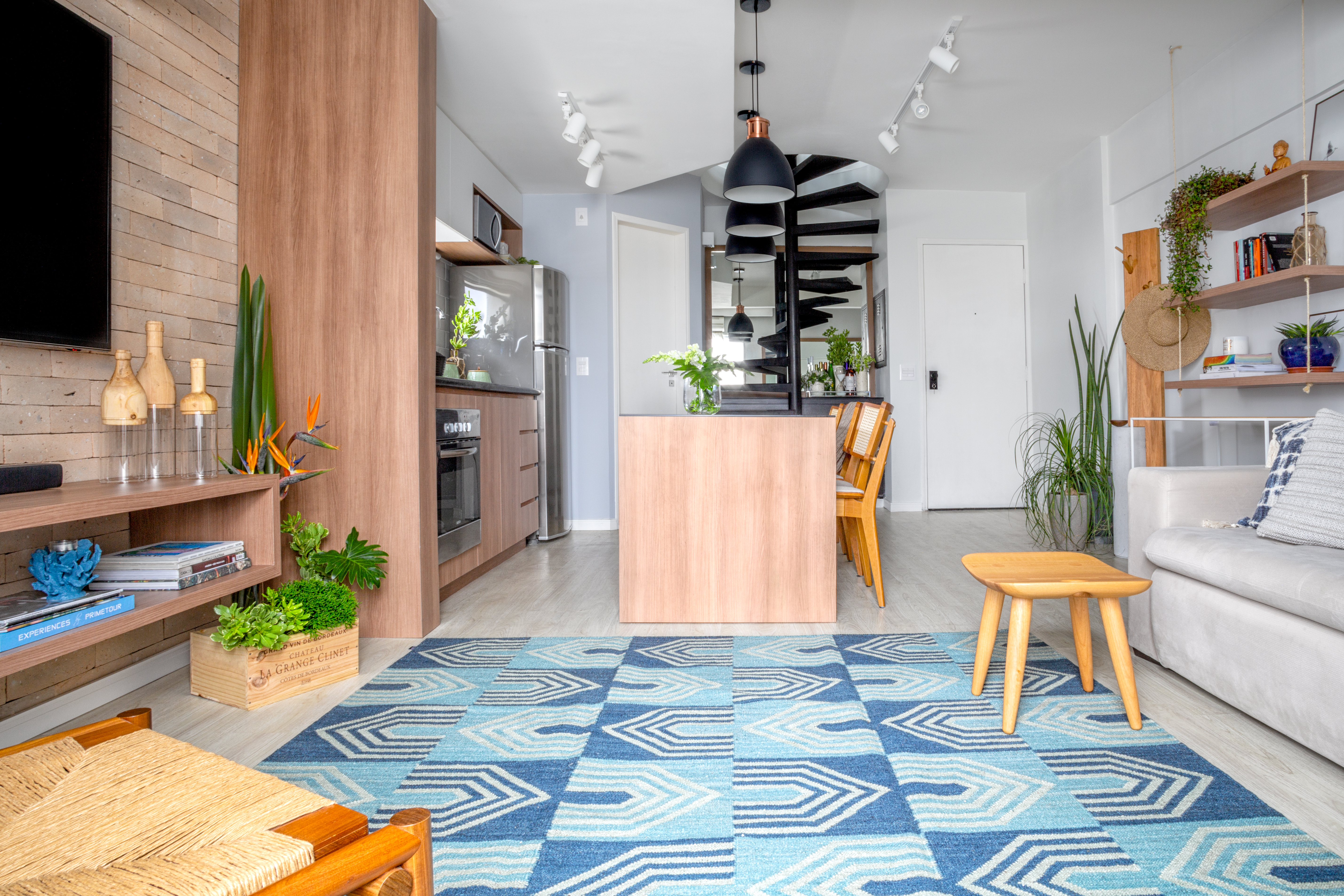 Mesmo em apartamentos menores é possível manter este clima, como é o caso do projeto da KZ Arquitetura. A natureza surge de forma delicada nos vasos espalhados pelo ambiente. O azul do tapete, e as madeiras claras transmitem leveza e paz.