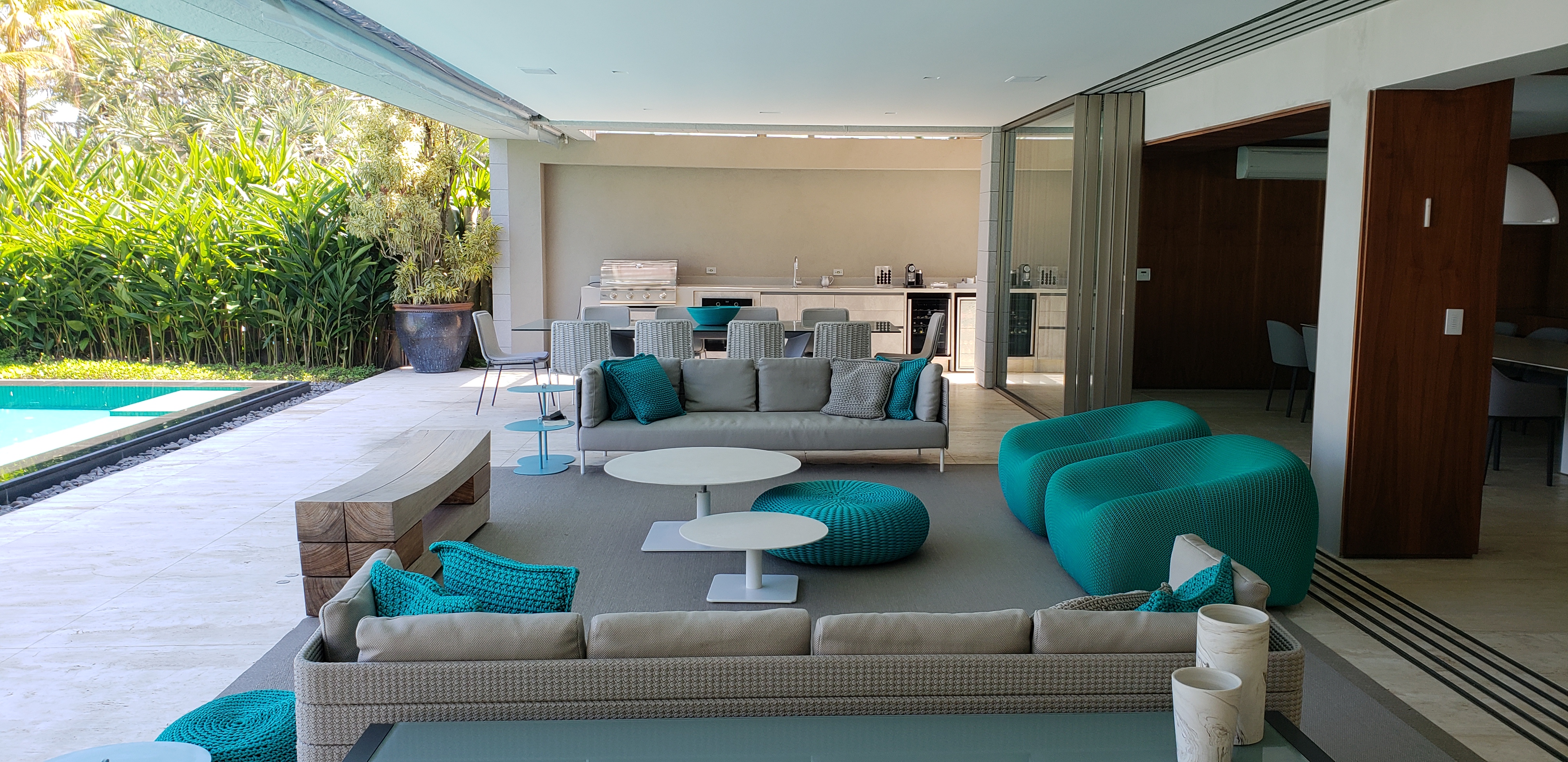 Neste projeto de Marcelo Rosset, por exemplo, o minimalismo dos móveis e uma paleta de cores delicada fazem uma reverência à natureza exuberante da área externa, criando assim uma composição, na qual a paisagem e a decoração estabelecem um diálogo fraterno, valorizando a elegância de ambos os elementos.