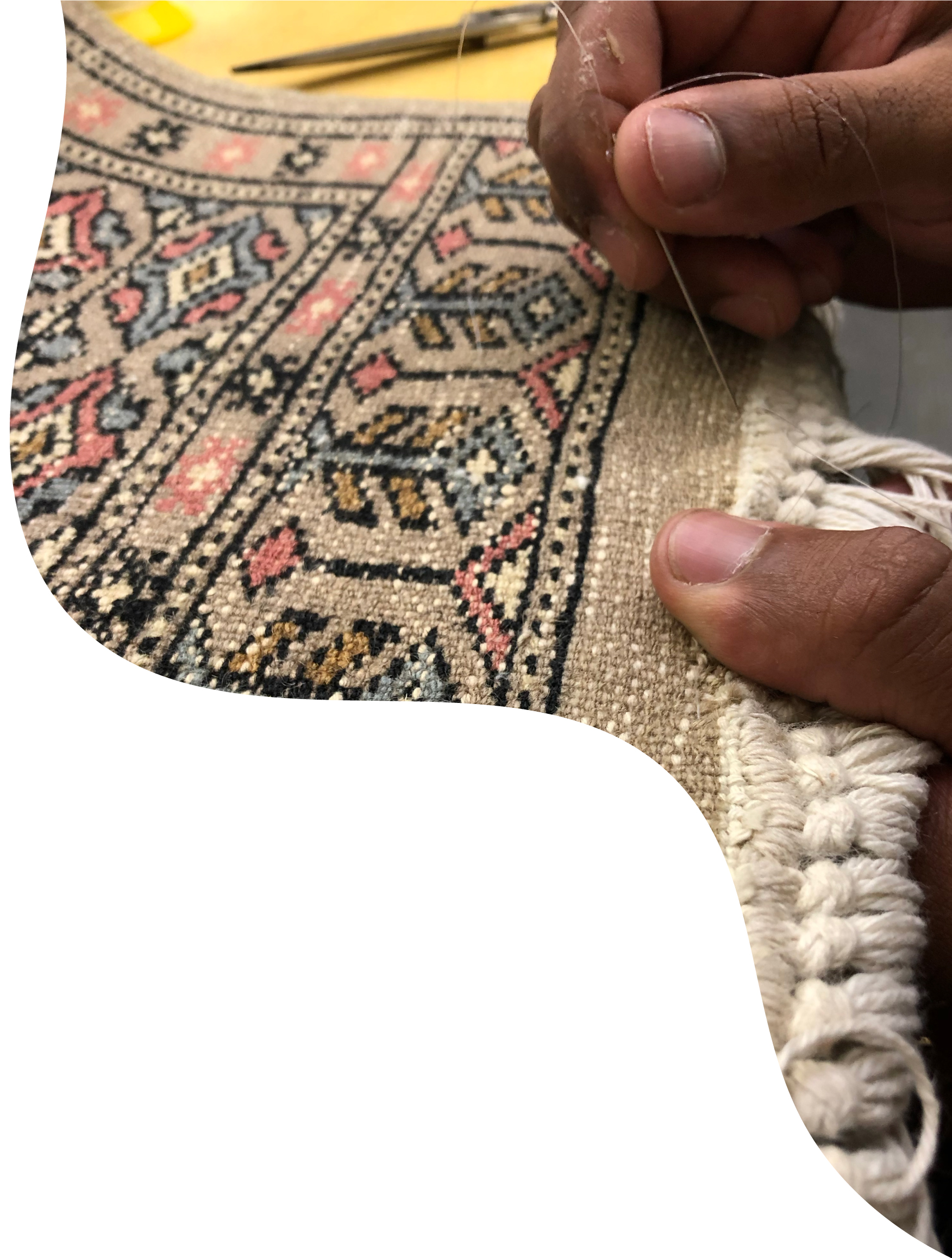 Se por algum motivo a borda do tapete precisar ser refeita, as formas mais comuns de acabamento são: cordão, barra virada e franja. O acabamento que fazemos é sempre o mais próximo do original.