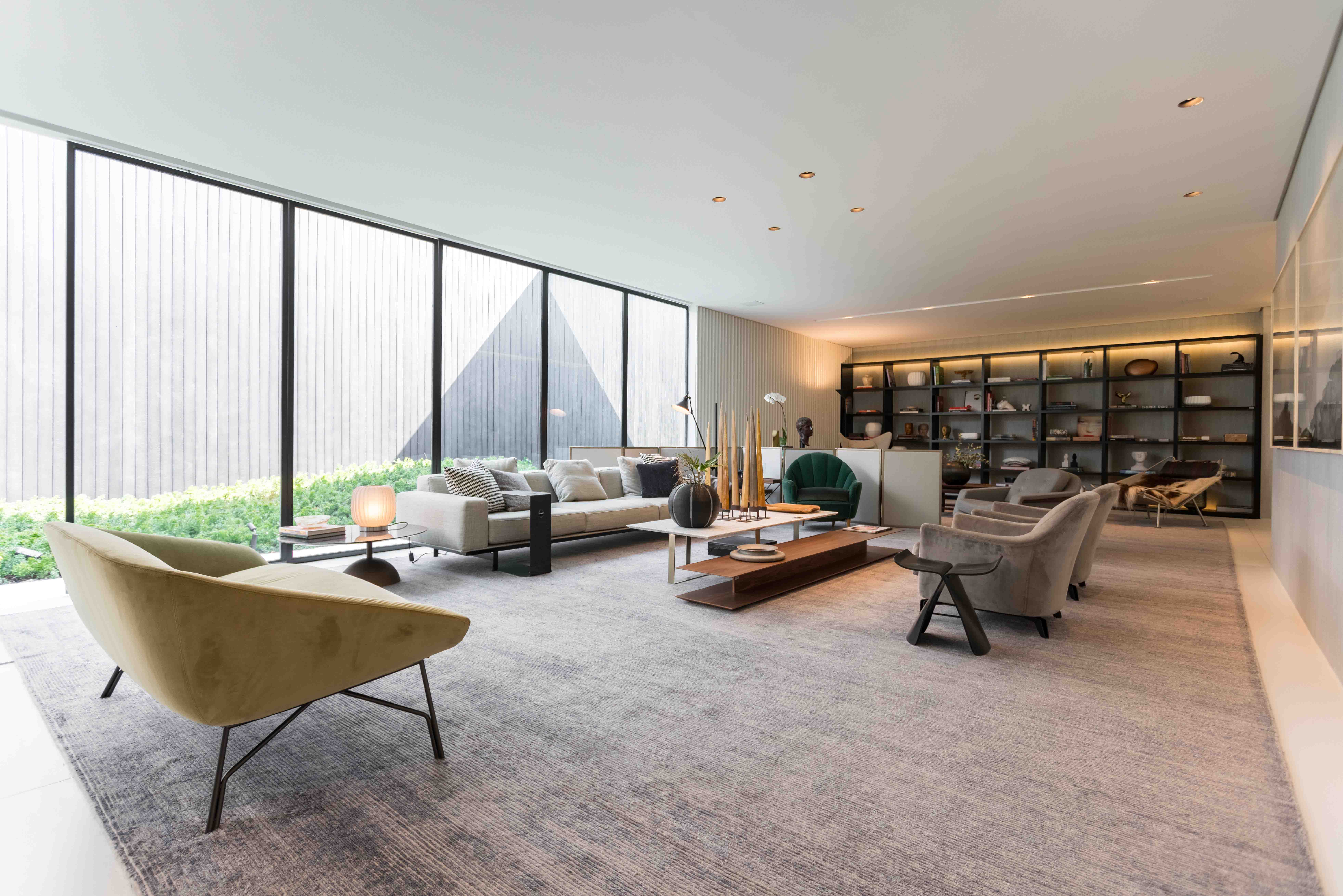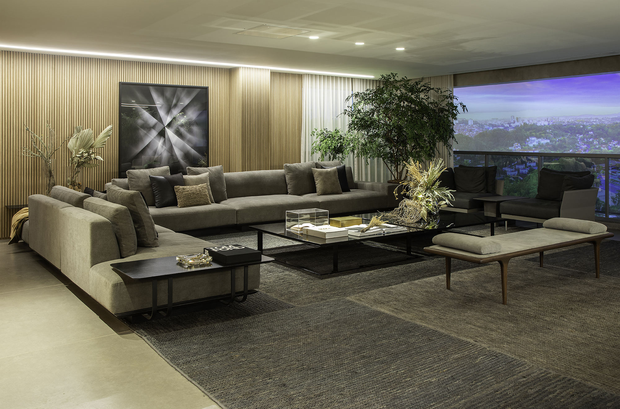 Apesar do tamanho generoso, o arquiteto João Armentano escolheu o nosso tapete Vignole Ivory-Dark Grey para abraçar todos os móveis e tornar o espaço mais aconchegante em sintonia com a paleta neutra que predomina no ambiente.