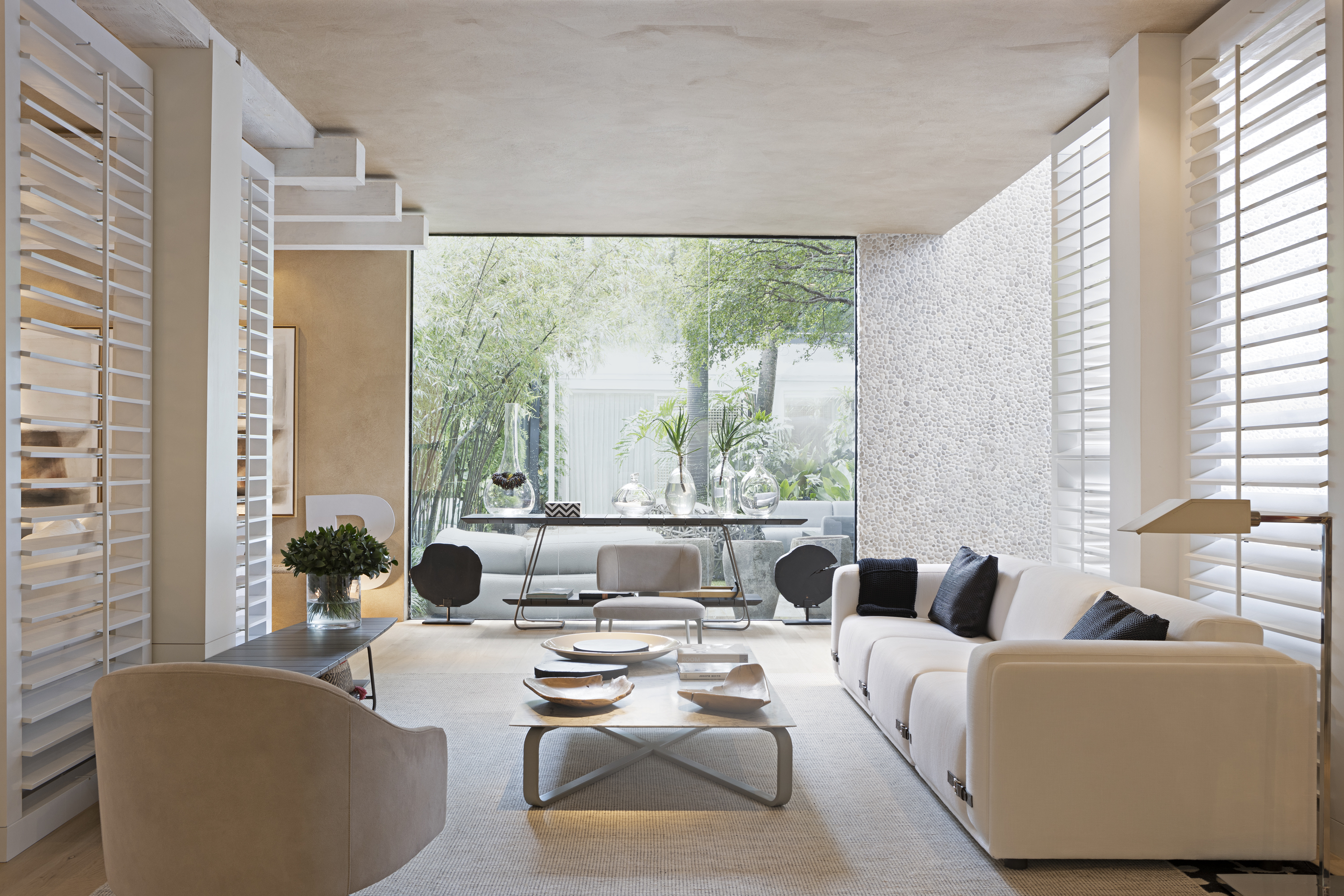 Neste living assinado pelo arquiteto Roberto Cimino e o designer de interiores e exteriores Nelson Amorim, tons de bege e cinza prevalecem e o tapete Dhuire Dali Max Mix Off White complementa à paleta o toque suave e agregador de sua superfície.