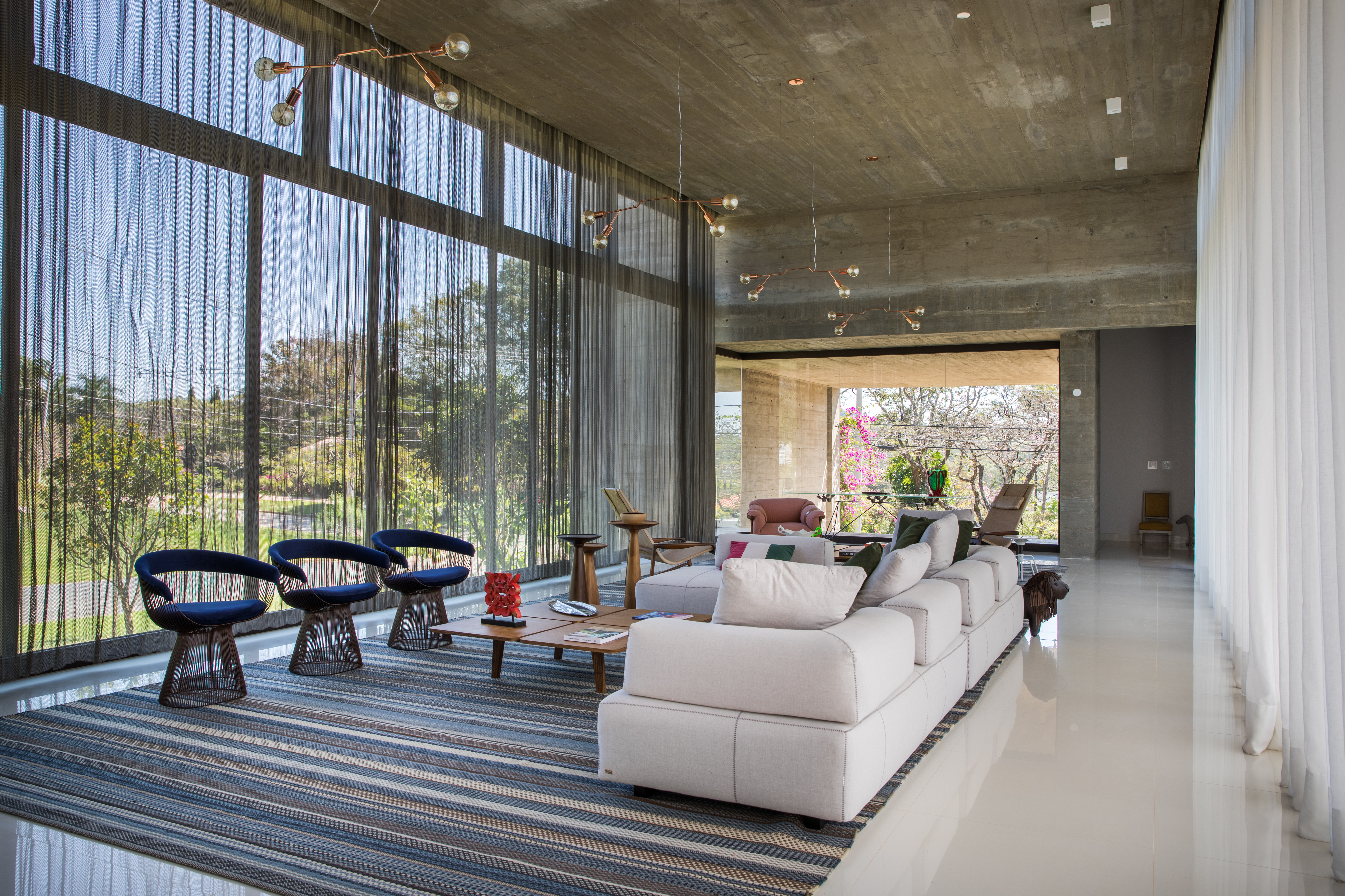 Aproveitando-se do pé-direito alto e uma vista deslumbrante para natureza, o arquiteto Olegário de Sá une diferentes peças de mobiliário a partir do tapete Kilim Uzbek Blue cujo contraste de cores e listras se destaca sobre o piso branco e frio.