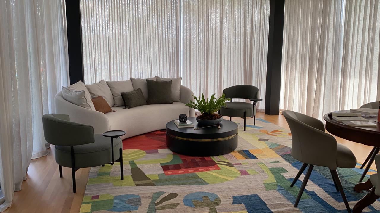 Para um living repleto de móveis em formas circulares e orgânicas, o escritório Ximenes & Leite Arquitetura acertou em cheio na escolha do tapete Kilim Sertão Mix Color Designer, assinado pela artista chinesa Yu Li Min para dialogar com o interior e a paisagem exterior.