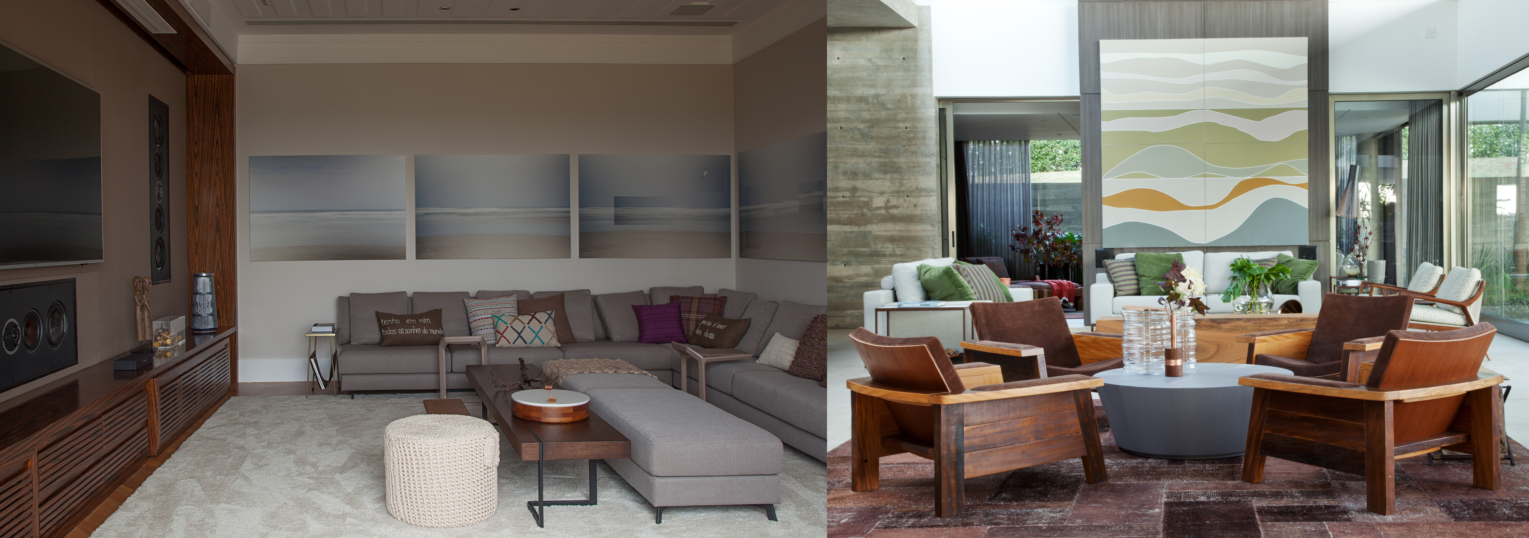 Livings – especialmente os muito grandes - são sempre desafiadores, pois apesar de serem potentes em tamanho, se não forem muito bem planejados podem trazer um ar solitário e gélido. Quem poderia ajudar a aquecer e unir? O tapete.