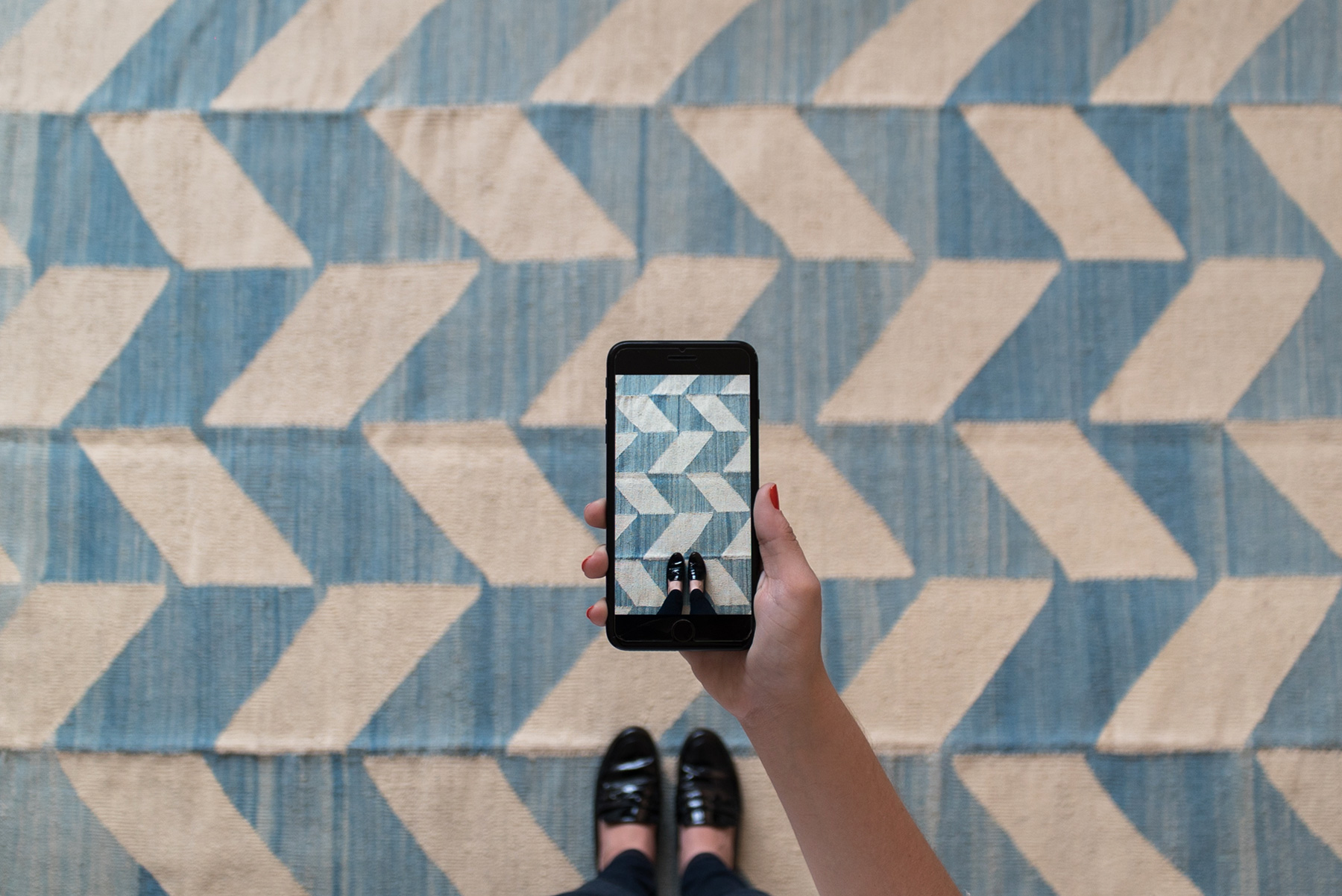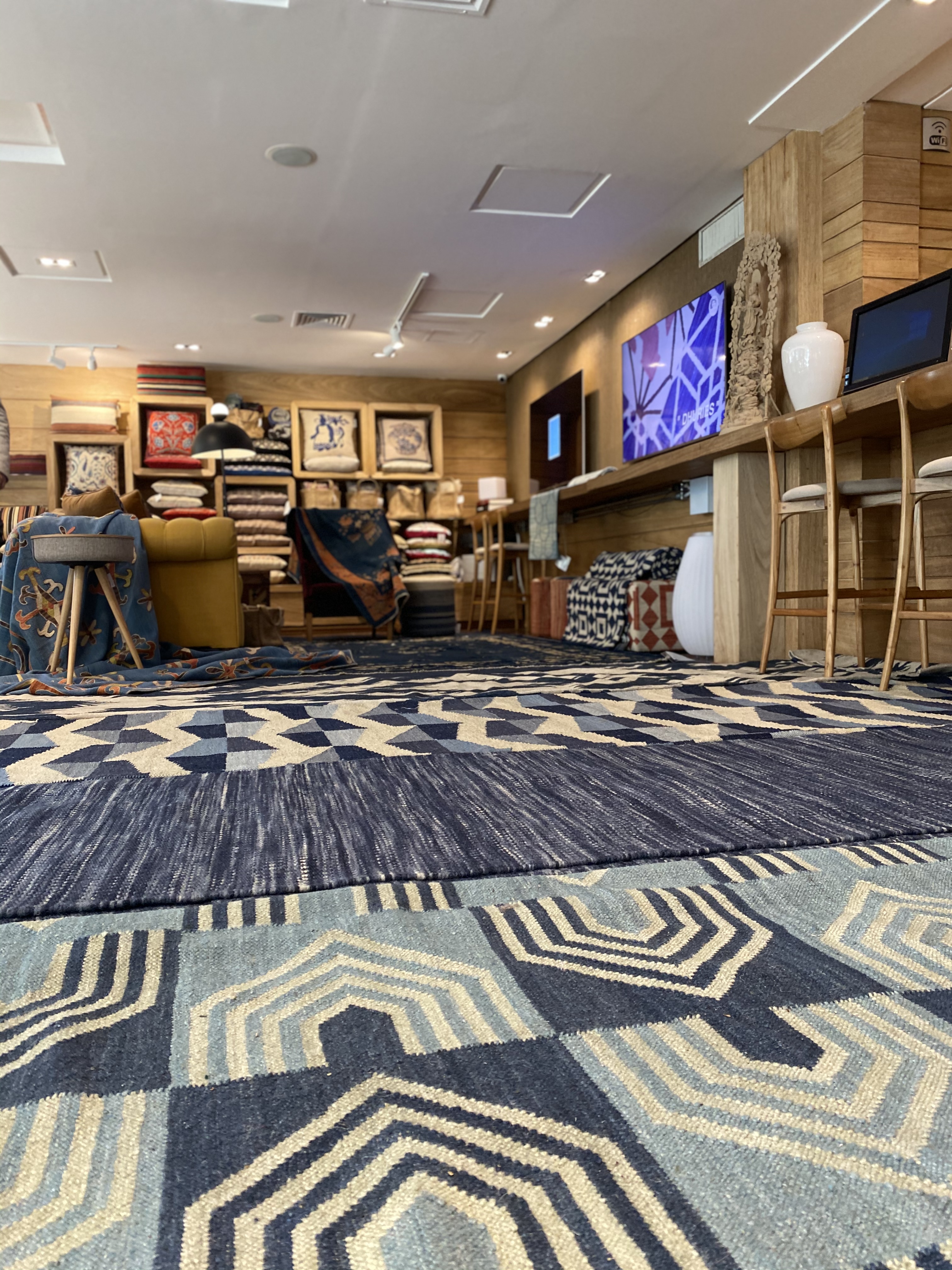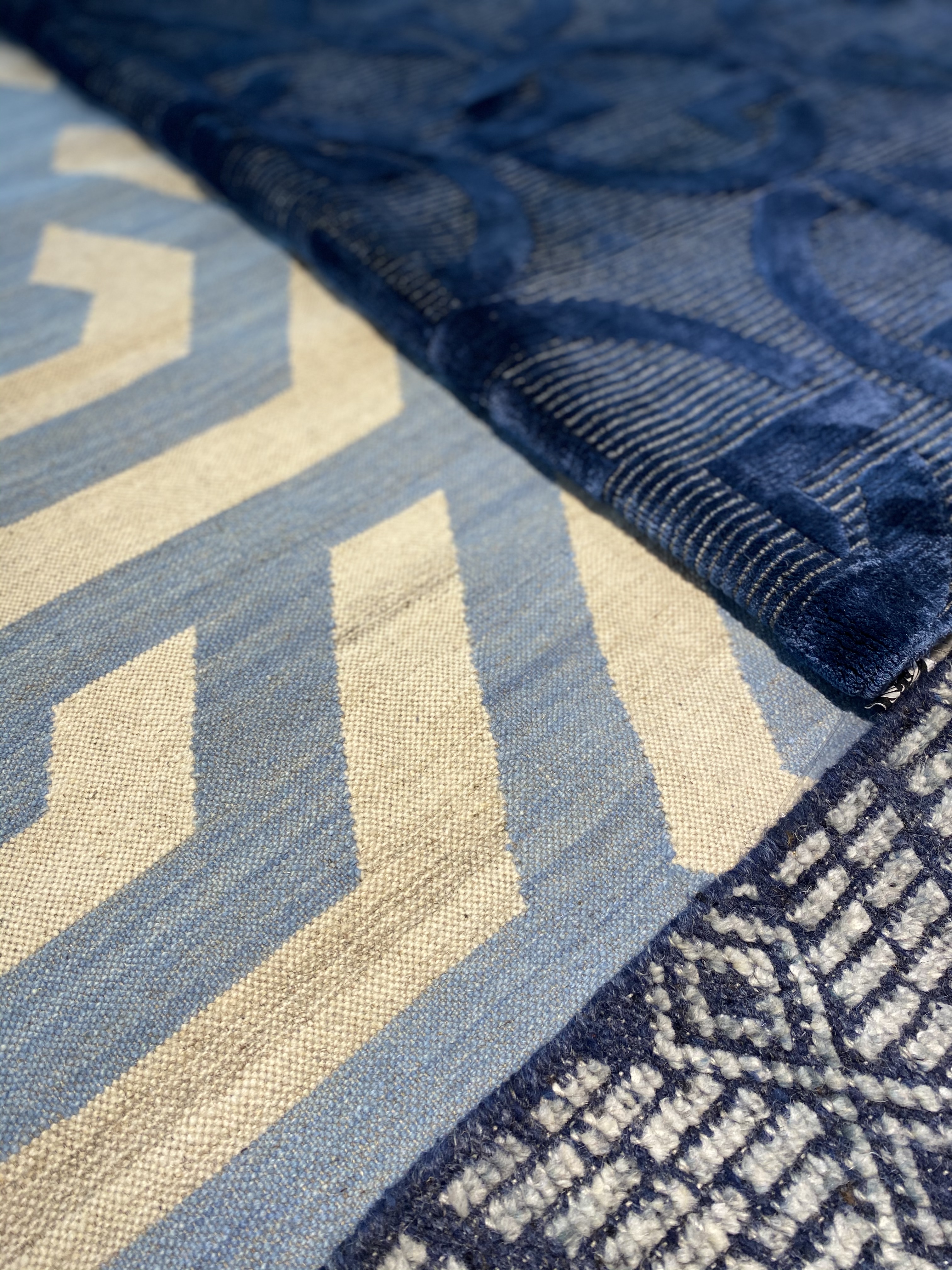 Outro aspecto importante se diz a sua versatilidade, tons e formas. É possível imprimir tanto um estilo reconfortante, quanto contemporâneo, como o exemplo do tapete geométrico azul, um potente fornecedor de estilo para qualquer ambiente. O mesmo ocorre quando se busca uma atmosfera mais elegante, usando um tapete azul marinho, num tom mais fechado, para aumentar a sofisticação do ambiente e seu mistério.