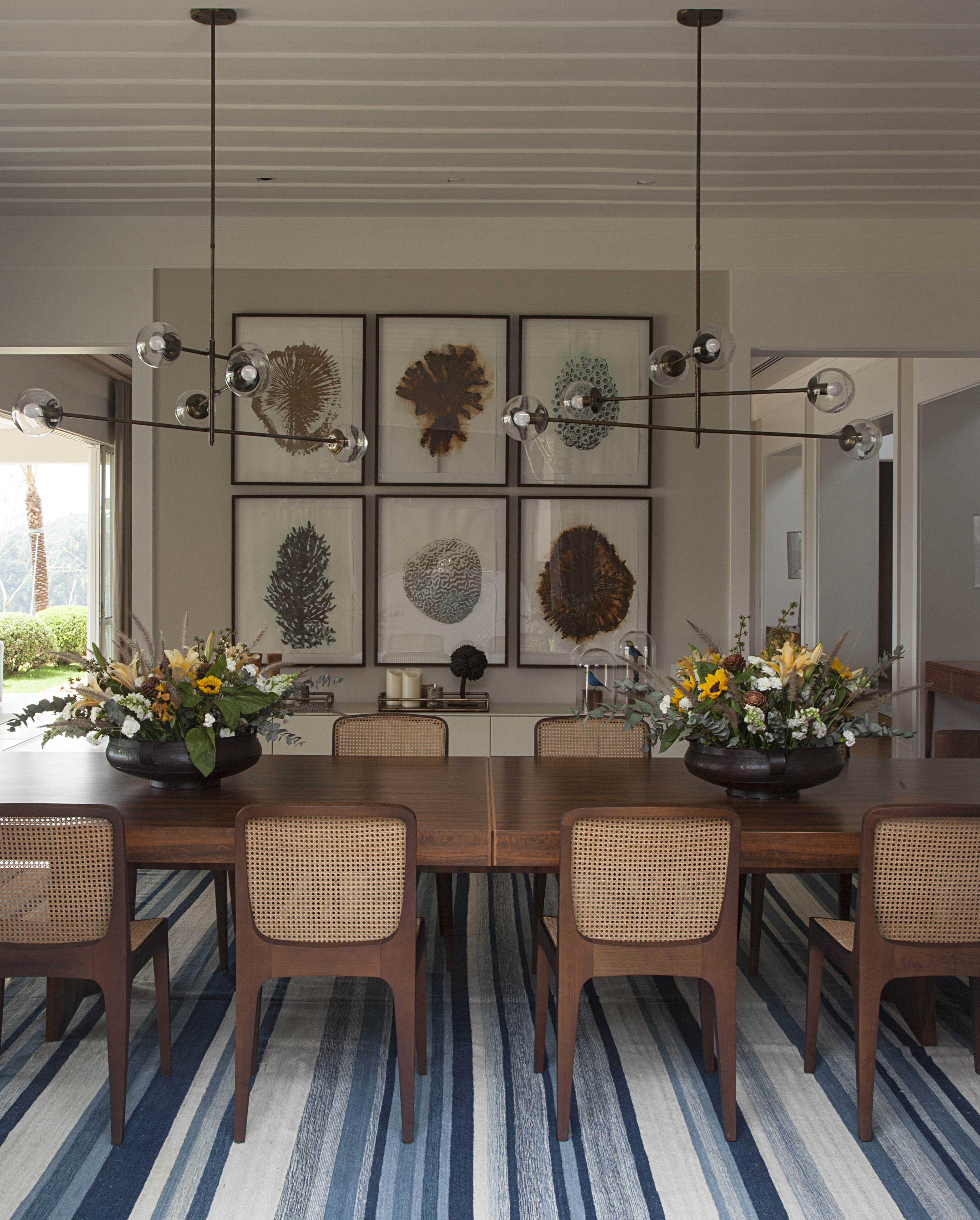 Veja que lindo esse ambiente da sala de jantar projetado por Alice Martins e Flávio Butti – AMFB com o tapete Kilim Magreb® 23! Esse tapete é o resultado da grandiosa exposição de uma técnica milenar da tecelagem aliada ao sofisticado processo manual de pigmentação de suas matérias-primas. Este especificamente foi tecido com todos os tons clássicos de azul da by Kamy.