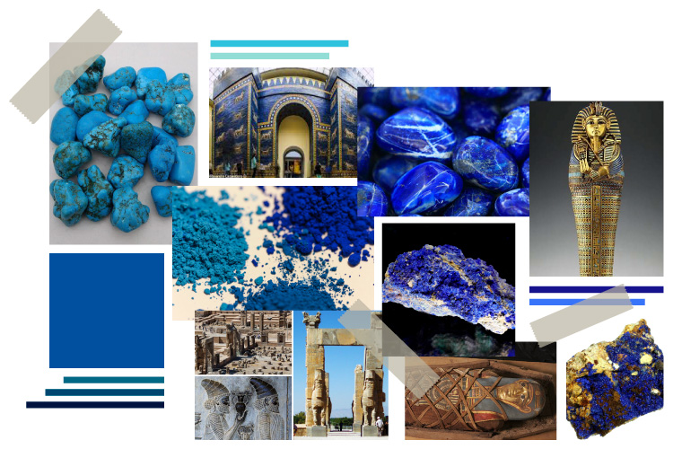 A palavra “Blue” (azul, em inglês) deriva do antigo germânico “Blau”, que eventualmente se tornou ‘bleu’ com o passar do tempo. Já a palavra azul tem origem na persa “Azhward”, nome original da pedra lápis-lazuli. Na antiguidade, essa cor era difícil de ser extraída, o que a tornava cheia de simbolismos e com uma aura de preciosidade em diversas civilizações. Gregos e Romanos, por exemplo, exploravam tonalidades como o vermelho e o dourado, mas não o azul. Há pouquíssimos registros históricos da presença desta cor nesta etapa da civilização. Porém, em diferentes partes do mundo, o azul foi sendo obtido de diferentes formas. Os tons desta cor eram batizados de acordo com as regiões onde eram extraídas. O turquesa é originário da Turquia. O índigo, da Índia.