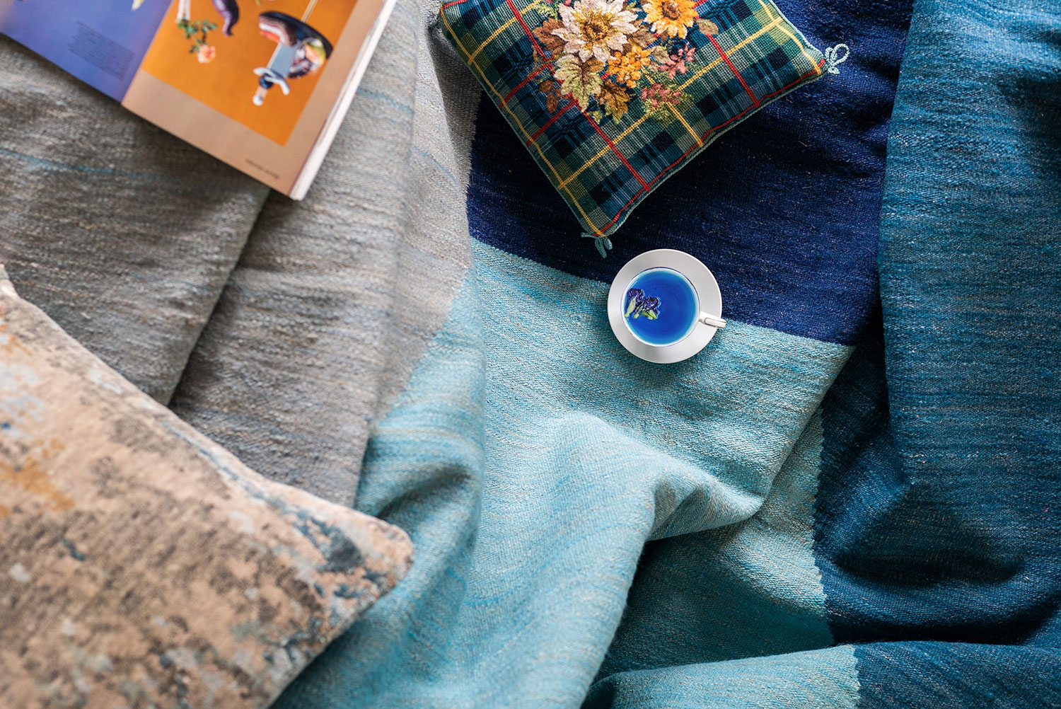 Levar o azul para dentro de casa não é uma tarefa difícil. Um aspecto maravilhoso da cor é o de, através dela, podermos transformar rapidamente e satisfatoriamente o clima de um lugar. Às vezes não é necessário repintar toda a casa, basta apenas um ambiente. Outras vezes não é necessária nem a pintura, basta o toque de cor em detalhes, com um tapete azul para a sala que seja vistoso e funcional.